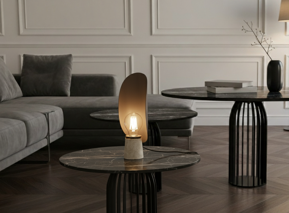 CRUNA è una lampada da tavolo dal design essenziale e scultoreo, composta da una base in cemento naturale e una paletta metallica curvata che funge da schermo riflettente. Il gioco tra materiali grezzi e forme morbide crea un’atmosfera calda e sofisticata, perfetta per ambienti minimalisti e contemporanei.