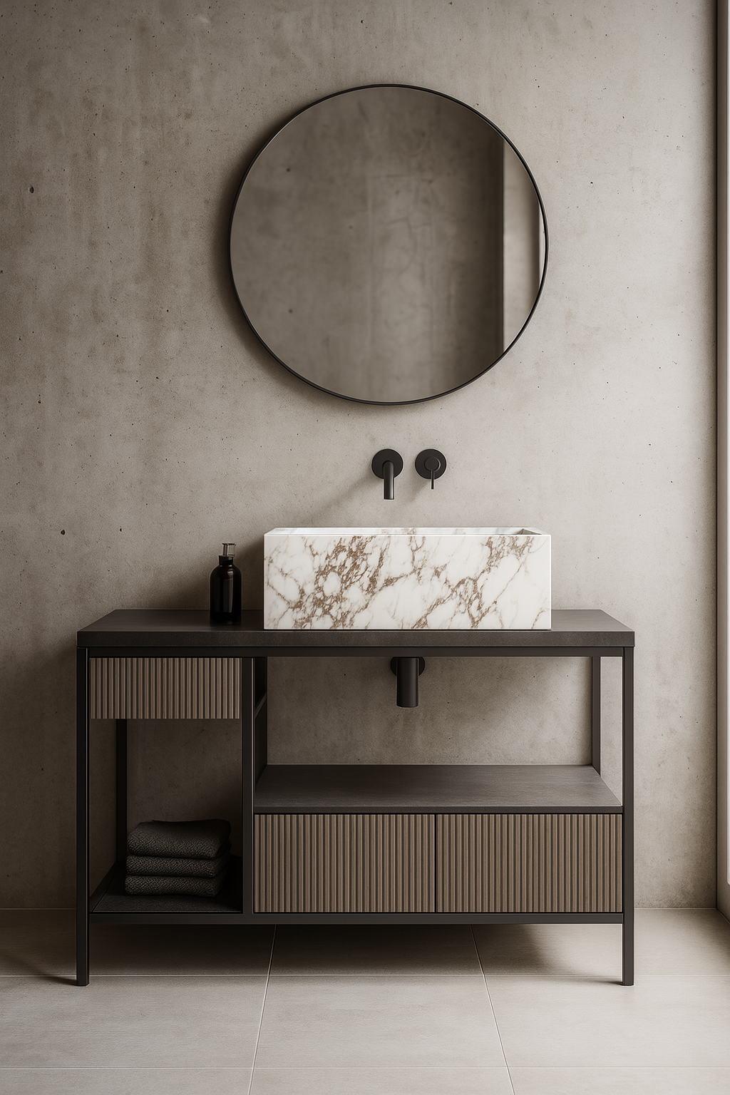 I cassetti in legno di noce rigato verticale introducono una texture raffinata e calda, creando un piacevole equilibrio tra modernità industriale e accenti naturali. Lo spazio sottostante include vani a giorno ideali per riporre asciugamani o oggetti di uso frequente, mentre i cassetti chiusi garantiscono praticità e ordine.